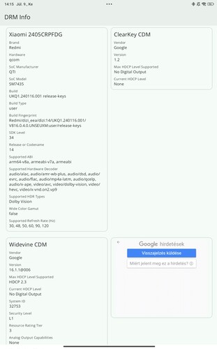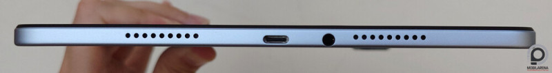 A beállítások között van lehetőség változtatni a frissítési frekvencián, a megjelenített méreten, van sötét mód és éjszakai kékfény-csökkentés, olvasó mód. Mindig éber kijelzés nincsen. A tabletben megvan a Widevine L1-es biztonsági kulcs, szóval HD-ban képes SVoD szolgáltatásokon streamelni, akár Dolby Vision tartalmat is például a Netflixen. HDR10 viszont nincsen, így YouTube-on HDR videót nem fogunk tudni megtekinteni. A sztereó hangszórók elhelyezése jó, mert az ember nem takarja kezével a készülék oldalán őket, ám minőségük közepes, 50% feletti hangerőn már sistergősen torzít. Ilyenkor jól jön, hogy támogatott az AAC, SBC, LDAC és aptX kodek is Bluetooth vezetékmentes hangátvitelre, illetve ott a 3,5 mm-es csatlakozó is vezetékes fül- és fejhallgatók számára, mely minden táblagépen alap kellene, hogy legyen.