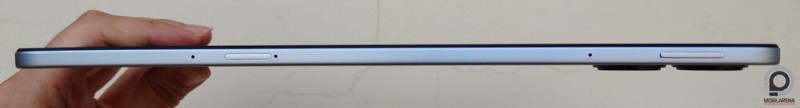 A keret szélein Dolby Atmos minősítést elnyerő sztereó hangszórók, felül mikrofonok, illetve hangerőszabályzó gomb. A bekapcsoló gomb a rövid oldalra került, ujjlenyomat-leolvasó viszont nincs benne, csak 2D-s arcazonosítást támogat a tablet. A kialakítás jó, kényelmes kézben fogni és használni a Redmi Pad Prót, de óvatosan vele konyhában vagy vízparton, mert IP-védettsége nincsen!