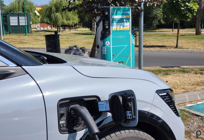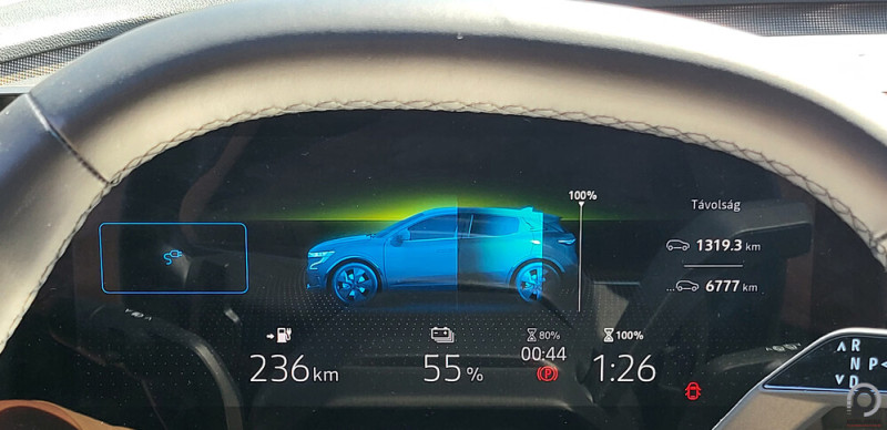 Viszont a töltésnél a Renault előnyben van kábé mindenki máshoz képest, mert a 130 kW-os DC töltés sem rossz, de a lényeg, hogy AC-n is fel tud venni 22 kW-ot, ami simán a duplája annak, amit a konkurencia kínál, de bőven vannak autók, amelyek csak 7,2 kW-tal csipegetnek AC-n. AC oszlopot pedig elég sokat lehet találni az országban, és azért az rendben van, hogy másfél órácskát sétáltam Tapolca belvárosában (némi vacsorával), 32%-kal álltam oda az oszlophoz és 80%-kal jöttem el. A jobb első kerék mögé rakott töltőnyílás mellett LED indikátor tájékoztat arról, hogy mi zajlik éppen, plusz külön gomb van az időzítéshez és a kábel oldásához.