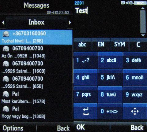 Message handling works with the usual options, the most sensitive part here is text entry. This works with the help of a virtual mobile keypad and finally the F490 includes shake-feedbacks in this situation too and, moreover, it is smart, because in this case the phone uses much smaller shakes, which is not disturbing, but perceptible. I don’t say that it’s the best fun in the world entering text through this interface, but it’s much better than it was in the F700 – in case we don’t take the QWERTY into account. There is an email client, it can handle attachments. The internal memory is 130 MB large, all applications share this, there is a separated space for the maximum of 500 text messages.