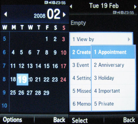 Amongst organizer functions we find a huge calendar, which works in month and week views. Entries can fall into five categories, like: meeting, anniversary, day off, important and private. These have a maximum amount of 100, 50-50 and 20-20 in this order. The world clock has only a list view. On such a screen? It’s a waste. The alarm clock has the usual functions, it works just well.