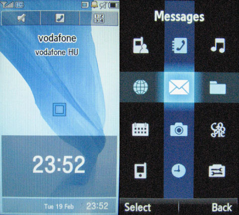 The designers changed the Croix system a little bit. The main screen changed in means that the top part now has only three icons, the menu cannot be accessed from here anymore, but we don’t miss it. The first from the left is the “hotkey” for silent mode; we have to rest our fingers for a long time on this in order to activate it. The central icon pops up the phonebook, while the right one activates the dial screen. If we want to get into the menu, then our task is to touch the blinking blue square in the middle of the screen. In the bottom stripe we can see either the clock, or the calendar; we can change amongst these by pulling our finger over the part and with lots of practice.