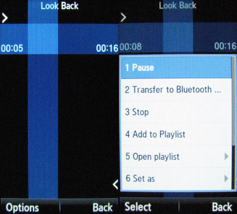 The music player works just like in the F700. An exceptionally huge cross is drawn, whose vertical stem can be pushed to set the volume, while its horizontal part can be dragged to seek in the music. When on loudspeaker, the F490 has a surprisingly good sound quality, but the best is with a headset, exceptionally when we use the standard input with a high-quality headphone instead of the factory one. The software sorts music by ID3 tags, the player runs in the background, playlists can of course be created. In terms of video playback avi and mpg are not supported, the machine handles 3gp format, in this case it switches to landscape view.