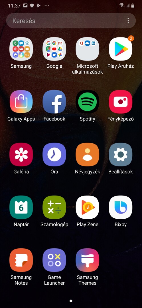 A gyári alkalmazáskínálat nincs túltolva, a Google szoftverei mind megvannak, ezen kívül van a Samsungnak is egy appcsokra, amelyben benne van a Samsung Healthy és a Wearable cuccok szoftvere, a Smart Things, a fájlkezelő, a Samsung Members, valamint egy saját böngésző, amit a Chrome helyett használhatunk. Akad egy jól kezelhető diktafon, gyárilag fent van a Spotify, az Office Mobile, a Facebook, a LinkedIn és a OneDrive, illetve a gyártó jegyzető alkalmazása is Samsung Notes néven. Ennyi, de ennél több nem is kell, a Play Áruház mindig nyitva áll. (És nincsen korhatáááár.)