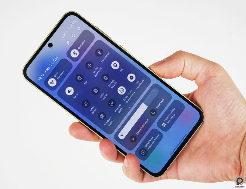 Távolról pusztán a forma megnyerő, ám közelről akadnak szépséghibái. Az alsó káva szélesebb a többinél, és ha már ekkora a keret, tényleg nem fért oda a közelségérzékelő a beszédhangszóró és a fénymérő mellé? Feleslegesen spórolt rajta a Samsung, de a képernyőbe épített ujjlenyomat-olvasó sem a legmegbízhatóbb: ötből egyszer sikertelen a regisztrált minta azonosítása, ez pedig az S23/S24-nél nem fordult elő. Egy picit tehát beragadt a tervezésekor a Samsung: nagy vonalakban minden rendben, ám lehetett volna a külsőn finomítani.