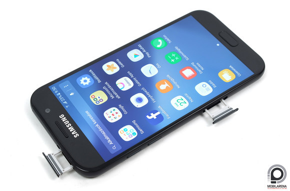 Alul Type-C USB-t és 3,5 mm-es jack csatlakozót fogunk felfedezni, valamint azt a tényt, hogy a 2017-es A5 sem szétszedhető, de most az alapvető masszivitás ígérete mellett ennek az is az oka, hogy megkapta a friss modell az IP68-as besorolást, magyarán elméletben 30 percet ki kéne bírnia vízben. Ez mindig problémás egyébként, mert ha mégis beázik, akkor ki bizonyítja, hogy nem volt-e 31 percig víz alatt, vagy nem vittük-e 151 cm mélyre, ugyanakkor most az összes csatlakozó fedetlen és belülről szigetelt, vagyis elméletileg a felhasználónak nem kell arra figyelnie, hogy minden gumírozott csatlakozó a helyére kerül-e, hiszen ilyenek nincsenek is a készüléken.