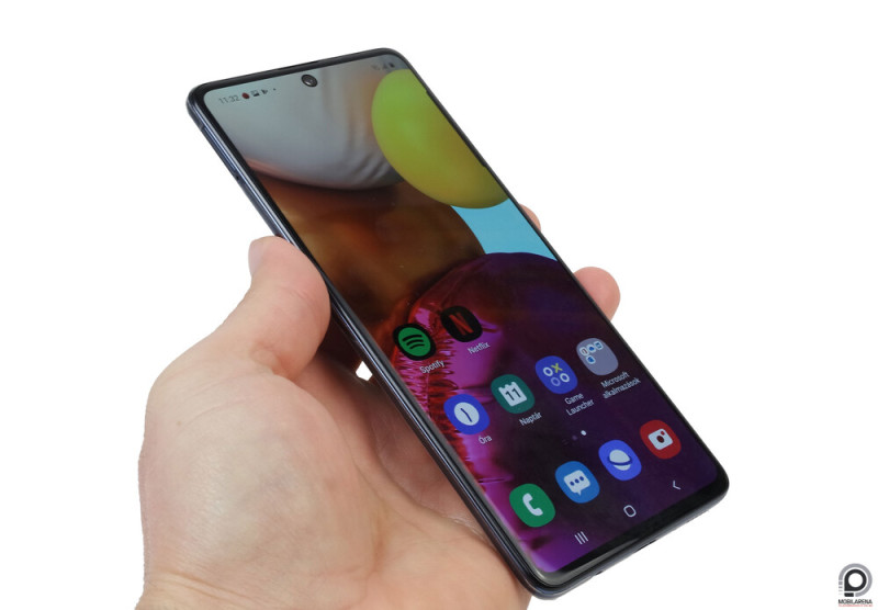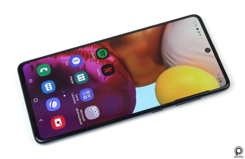 Az A71 kemény 4 grammal könnyebb, 0,2 milliméterrel vékonyabb, alig észrevehetően keskenyebb és rövidebb, de így is egy tepsi, amit a 6,7 inches Super AMOLED kijelző határoz meg. Ez továbbra is igen korrekt, az 1080 x 2400 pixeles felbontás ugyan nem rúgja rá a retinánkra az ajtót, de a célnak abszolút megfelel, a maximális fényerő igen combos, de közben le lehet csavarni annyira, hogy este nem veri ki a szemünket. Az ujjlenyomat-olvasót ezúttal is a panel mögé rejtették, feloldási hatékonysága azonban a mi tapasztalataink szerint nem lett jobb: érdemes ugyanazt az ujjunkat kétszer is rögzíteni, hogy nagyobb százalékban sikerüljön elsőre bejutni a menübe.