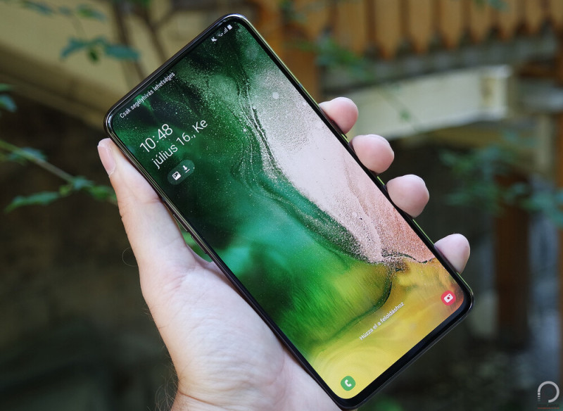 - amelyik csupa képernyő, bármilyen noccs vagy luk nélkül, a hátlapi 48 + 8 MP + ToF kamerarendszer ugyanis motorikusan emelkedik ki és fordul a júzer felé (viszont konstrukciós okokból ugrott az IP-védelem);