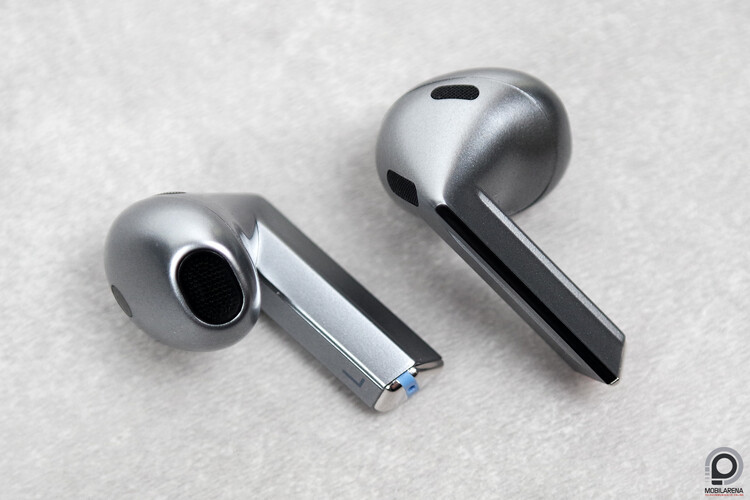 A Samsung Galaxy Buds3 a dél-koreai gyártó idei olcsóbb fülhallgatója, bár alapvetően a 70 ezer forintos indulóár nem sokkal marad a százezres Buds3 Pro alatt. A sima Buds3 viszont más iskolát követ, ez egy félig nyitott füles, ami a fülkagylóban ül, nem tör be a hallójáratunkba gumiharangokkal. Az ezüstös plasztik külső IP57-es védettséget élvez, ránézésre pedig olyan, mint egy Tesla Cybertruckba oltott Apple AirPods 3 a száras dizájnnal, melyen az Apple lágy ívei helyett itt durva egyenes vonalak fogadnak minket. Ezek okán egyébként a tokba is nehezebb visszatenni a Buds3-at, mert megfelelő szögben kell fordítani, hogy a kis háromszögek fedésbe kerüljenek.