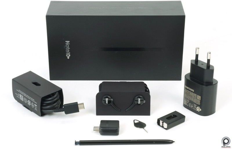 És még egy nyomorult jack adaptert sem mellékelt a tartozékkínálatba. Cserébe kapunk egy Type-C csatlakozóban végződő, minőségi, harisnyázott kábellel szerelt AKG, mikrofonos, vezérlőgombos, sztereó in-ear fülhallgatót, háromféle méretű gumiharanggal. Nekem pont az eleve felapplikált közepes a legkényelmesebb. Jár ezen kívül egy Type-C - Type-C töltőkábel (Type-C - USB-A-t szintén szerezzen magának a júzer), amit a 25 wattos Super Fast Charge hálózati töltőfejjel ildomos használni. A Samsungnak meg jár egy hangsúlyos ejnye-bejnye, mivel a Note10+ 45 wattos teljesítményt is feldolgoz, ha leszünk szívesek külön megvásárolni az ehhez szükséges adaptert, miközben van konkurens, amelyik a 40 wattosat is kérdés nélkül mellé csomagolja. Az USB-C OTG adapter idén sem maradt ki, a tollhegy cseréjéhez szükséges csipesz, a pót-tollhegyek és a SIM-tű pedig nyilván evidens. A kijelzőre mérnöki precizitással illesztett, szinte észrevétlen fólia viszont újdonság és értékeljük is, mert tényleg hasznos.
