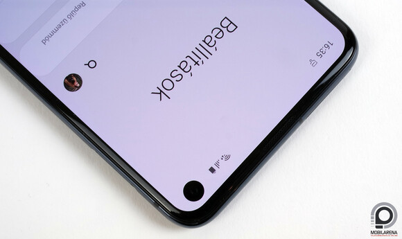 Kávák nem nagyon maradtak az előlapon, a beszédhangszóró, ami egyébként az alsó élen vágott multimédiás sztereó párja, a kerethez kapcsolódik, a fény- és közelségérzékelő szenzorok pedig a kijelzőbe kerültek, valahova a 10 megapixeles szelfikamera alatti területre. A drasztikus kávamentesítés lyukasztós megoldással történt, az előlapi kamera konkrétan ki van vágva az 5,8 hüvelykes, 1080 x 2260 pixel felbontású, úgynevezett Dynamic AMOLED panelből. Nem csak a megnevezés, a technológia is új, ami majdnem fele annyi irritáló kékfény kibocsájtást jelent, mint a hagyományos Super AMOLED, feltűnően színhelyes a kalibrálása és HDR10+ kompatibilis.