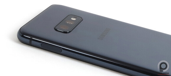 A hátlap íves kialakítása és alapvető elrendezése szintén megegyezik a szériában, az S10e horizontális tájolású paneljére csak két kamera került. Ugyanazok, mint az S10 és S10+ rendszerébe, mínusz a telés lencse. A 12 megapixeles normál kamera és a 16 megapixeles ultraszéles látószögű szenzor mellett LED villanó van, pulzus- és véroxigénszint mérő szenzor viszont nincs. A diszkrét Samsung felirat a szokott helyen, a vezetékmentes töltéshez szükséges tekercsek pedig a hátlap alatt.
