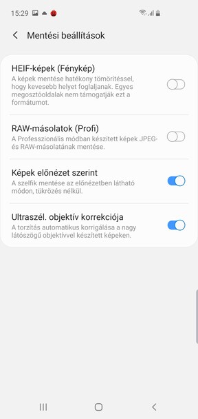 Az Instagram-mód azt tudja, hogy élből Insta-kompatibilis formátumot prezentál és azonnal küldi is az alkotást a platformra. Ez nem hangzik veszélytelenül, de előtte nyilván szerkeszthető a kép. Professzionális módban 50 és 800 között állíthatjuk az érzékenységet, a záridőnél 1/24000 és 10 tartományban variálhatunk, illetve válthatunk f/1,5 és f/2,4 rekeszérték között, a színhőmérséklet, a tónus, a kontraszt, a telítettség, a kiemelés és az árnyékok pedig csúszkán állíthatóak. Van kézi fókusz, fehéregyensúly 2300 és 10000 Kelvin között, illetve expozíciókorrekció +/-2 tartományban. RAW másolatokat a Mentési beállítások között kérhetünk, menthetjük a képeket HEIF formátumban is, illetve kérhetünk automatikus korrekciót az ultraszéles látószögű felvételek torzításához. A HDR szintén a beállításokban kapcsolgatható, automatikus vagy állandó üzemmódra.