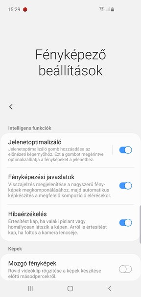 A kezelőfelület rengeteg beállítási lehetőséget kínál, viszont nincs bonyolult-érzete. A módok között az élőkép simításával válthatunk: Insta, étel, panoráma, professzionális, élő fókusz (négy különböző háttérelmosási effekttel), fénykép (ultraszéles és széles látószöggel), majd videó, szuperlassítás (720p 960 fps), lassítás (1080p 240 fps) és hyperlapse. Ezek elérési sorrendjét is módosíthatjuk, illetve rögzíthetjük a legutolsó kamerabeállításokat, így a legutoljára használt módban indul el a program legközelebb is. A felső sorban olyan készségeket kezelhetünk, mint a LED segédfény, időzítő, képarány és filterek. A beállításokban vannak még trükkök, engedélyezhetjük a jelenetoptimalizálás (kvázi AI) gyorsgombját, ami igény szerint harminc különböző témát tud megkülönböztetni és annak megfelelően optimalizálni a képbeállításokat.