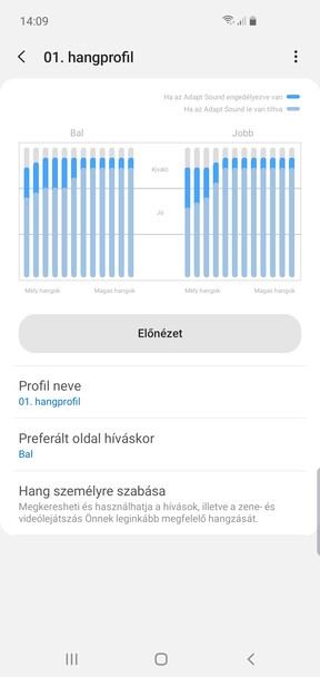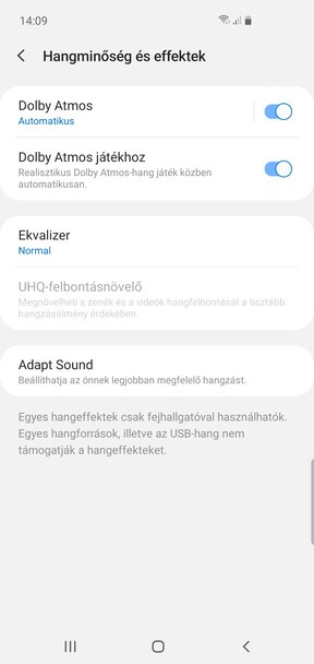 A zenelejátszót alapból a Google biztosítja, de itt is elérhető a Dolby Atmos és a Samsung féle, személyre szabott hangzást kínáló Adapt Sound. Meg persze a hangszínszabályzó. A mellékelt AKG füles tökéletesen kényelmes és kiválóan szigetel zenehallgatáskor. A hangprofilt megadhatjuk korosztályos alapon is, de ha a 30-60-ig besorolást kicsit tágnak érezzük, egyéni finomhangolás is lehetséges. Mi ezt alkalmaztuk, körülbelül 3 perc beállítani. A mellékelt AKG fülhallgatóra jutó hangminőség egészen kiváló, természetes, dinamikus, tere és mélysége van, kifejezetten részletgazdag és erőteljes. A maximum hangerő közel tűrhetetlen, de abszolút nem torzít.