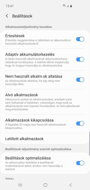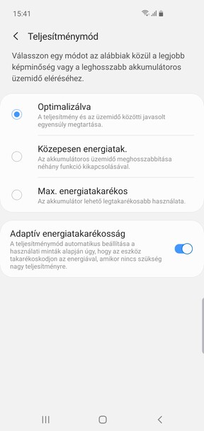 A szerény termet okán az akkumulátor sem kifejezetten vastag, de a 3100 mAh-s teleppel egész jól elvan az S10e. Az energiafogyasztás a felhasználási szokásokhoz igazodik, így nagyjából egy hét, mire az üzemidő úgymond beáll. Alapvetően 16 órányi netezés és videózás jön ki a telepből 150 nites fényerő mellett, ami figyelembe véve a teljesítményt, korrektnek mondható, de az egy napot meghaladó üzemidőre nem fogadnék, ha sokat nyomkodjuk a készüléket. 5 óra körüli kijelzőidő lehet reális és stabilan egy hosszú napnyi szolgálat. Az akkumulátorbeállításoknál érdemes körülnézni, hogy milyen lehetőségeink vannak a takarékosságra és optimalizálásra.
