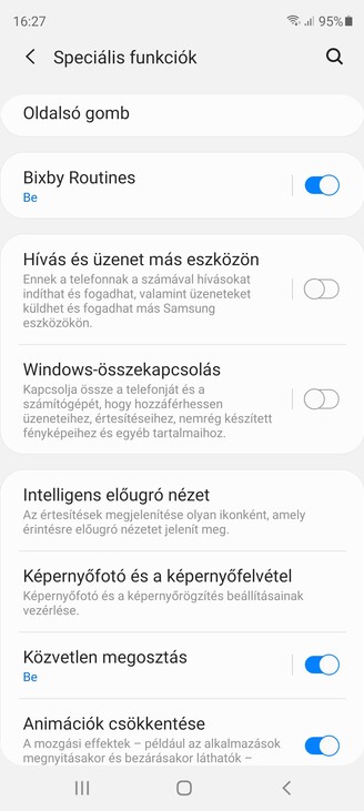 Beállítási lehetőségből és kényelmi extrából viszont szokás szerint rengeteg van. A rendszernavigáció One UI 2.5 esetében már harmadik féltő származó launcherrel is működik gesztus alapon, de természetesen megmaradtak az átrendezhető virtuális navigációs gombok is, ha valaki azt szereti. Az Edge panel többek között még mindig remek alternatívája az alkalmazásváltónak, ahová alkalmazáspárokat is tehetünk, amelyek fixen együtt nyílnak meg osztott nézetben. A legtöbb extra pedig a Speciális funkciók címszó alatt lesz.