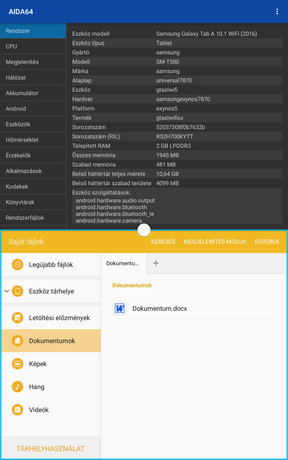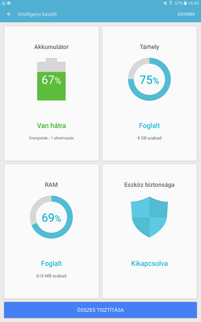 Nem csak a magok és a megahertzek számítanak egy eszköz teljesítménye kapcsán, a gyártósori fejlődés sem elhanyagolható, és az idei Tab A a 14 nanométeres csíkszélességgel gyártott Samsung Exynos 7870-et kapta nyolc, legfeljebb 1,6 gigahertzen ketyegő Cortex-A53 maggal. Ez elég jó kombináció a középkategóriában az átlag feletti sebességhez, elfogadható alkalmazáskezeléshez vagy a honlapok fürge betöltéséhez, miközben a fogyasztás alacsony marad. A Mali-T830-as IGP ugyanakkor vérszegény Full HD-n, és messze elmarad a felső-középkategória elvárásaihoz képest (Snapdragon 650, Helio X10/X20). Ez a TouchWiz meg-megakadó felületén és a komolyabb 3D-s játékokon is meglátszik: sem a Real Racing 3, sem az Asphalt 8 nem hoz élvezhető képfrissítést, bár komolyabb melegedéssel nem jár a gaming. A 2 gigabájt RAM / 16 gigabájtos belső tároló kombinációja sem túl bőséges. A felhasználónak 10 gigabájt szabad hely jut, a microSD kártyára pedig nem lehet telepíteni.