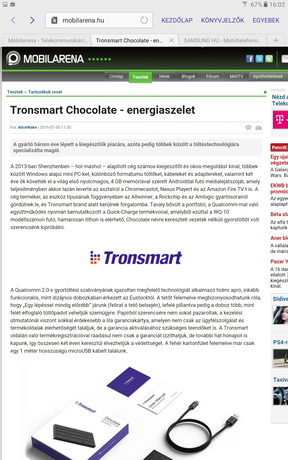 A honlapok többsége dadogás nélkül görgethető, a vaskosabbaknál viszont már előfordulnak késedelmek és döccenések. Opció a könyvjelzők mentése, az inkognitó böngészés, a váltás asztali és a mobilnézetre, sőt: akár más eszközökön mentett ablakokat is meg lehet nyitni a Tab A-n, ha a felhasználó a Samsung vagy Firefox-fiókjába be van több helyről jelentkezve. Ekkora méretben órákig kényelmesen lehet böngészni, bár ennyi ideig kényelmetlen kézben tartani a fél kilós monstrumot.