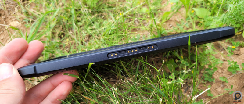 A készülék tele van gombokkal és csatlakozókkal. A kijelző alatti három fizikai gomb ritkaság a mai táblagépes mezőnyben, a jobbra tett hangerőt szabályozó és ki-bekapcsoló billentyűk mellett pedig pirossal löttyintve egy programozható gomb is akad. Alul Type-C csatlakozót és jack kimenetet fogunk találni, jobbról pedig a SIM-et és a microSD is fogadó tálca húzható elő. Itt van középtájt egy egyedi interfész, amivel a Tab Active3 különböző tartozékokkal tud kommunikálni, főleg egyébként töltésre használható akkor, amikor egy cégnél egy rakás ilyen tablet van és egy soktálcás dokkolóállomásba szokás őket betenni egymás mellé a nap végén.