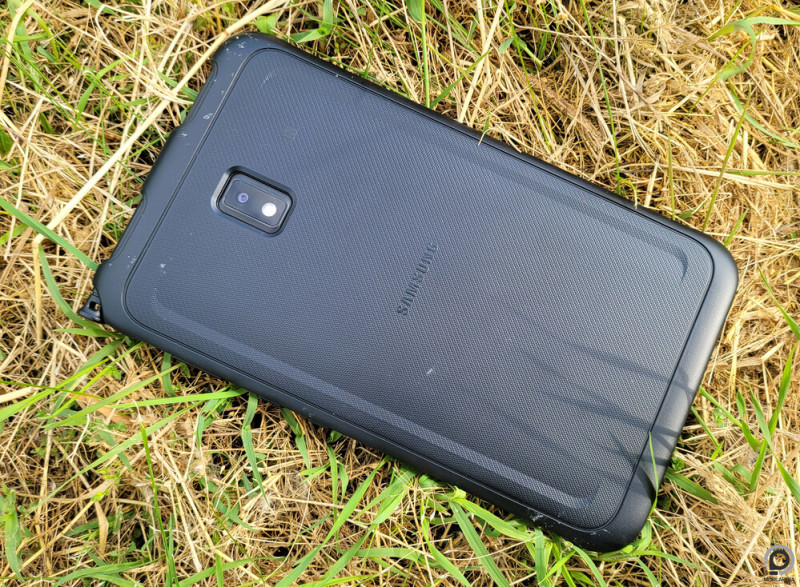 Az extra védelemtől megfosztott tablet is láthatóan jól felkészült arra, hogy ellenálló legyen, a négy sarokban erősített a műanyagburkolat, a hátlap csúszásmentes, recézett kialakítású, a kijelző alatt fizikai gombok vannak (a középsőben ujjlenyomat-olvasó szenzorral), szóval nem meglepő, hogy a gép előlapjának méretéhez képest viszonylag ablakszerű a kijelző, amely csak 8 hüvelykes, PLS IPS panelt használ és 1200 x 1920 képpont megjelenítésére hajlandó. A fényerő nekem direkt napfény alatt kevésnek tűnt, illetve a tükröződés is erőteljes, a színek viszont szépek, a kontraszt is rendben van.