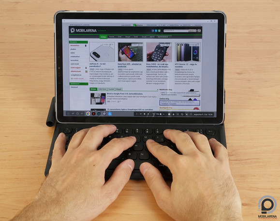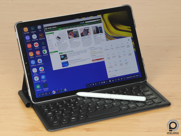A Samsung ezúttal tehát a produktivitást tűzte zászlajára, noha az is igaz, hogy bár a 10,5”-es képátló, vagy a 249,3 x 164 x 7,1 milliméteres és 483 grammos paraméterek nem éppen aprók, azért messze a 13”-es ultrabookok munkára alkalmatos terebélyessége. A külön beszerezhető billentyűzetes tokkal mindenesetre laptop konvertálható a tabletből, az angol feliratozású klaviatúrán pedig az összes magyar ékezet elérhető, úgyhogy a tesztet saját alanyával kezdtem megírni. Meglehetősen kényelmetlenül, jegyezzük meg, mert annyira aprók a billentyűk, de még mindig komfortosabban, mintha érintőképernyőn pötyögtem volna be. A billentyűzeten amúgy akad extra gomb nyelvváltásra és gyorskeresésre (ami DeX módban az alkalmazásmenüt is feldobja), jó lett volna viszont, ha a vissza, főoldal és alkalmazásváltó is kap egy-egy gombot. Ott van aztán az S Pen, ami egész hatékonyan váltja ki az egeret, és pontosabban lehet vele bökni a képernyőn, mint saját ujjunkkal. Bluetoothon vagy egy multi-port kiegészítővel, USB-n pedig egér és opcionális billentyűzet is csatlakoztatható, szóval nem kell ragaszkodni a tartozékokhoz.