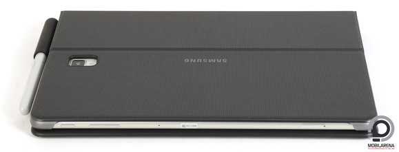 A vékony oldaléleken már több az esemény: fektetve alul pillantható meg a Pogo csatlakozó és a két mágnes, amelyekhez a tokon felül egy stabil töltőállvány is hozzácuppanhat, szintén külön megvásárolva. A 7300 mAh-s telepet persze elsősorban rövid oldalon, a Type-C porton tölti majd az ember, és jó hír, hogy mellette a 3,5 milliméteres kimenet megmaradt. Hangszóróból itt is és balra is megpillantható kettő-kettő. Felül a bekapcsoló és hangerőszabályzó talán túl apróra és keskenyre sikeredett, plusz nem lett volna rossz egy képernyőzár szoftverfunkció, hogy ne kelljen a billentyűt mindig keresgélni. Ha viszont a Tab S4 a tokjában van, elég csak összecsukni, és a kijelző kikapcsol magától.
