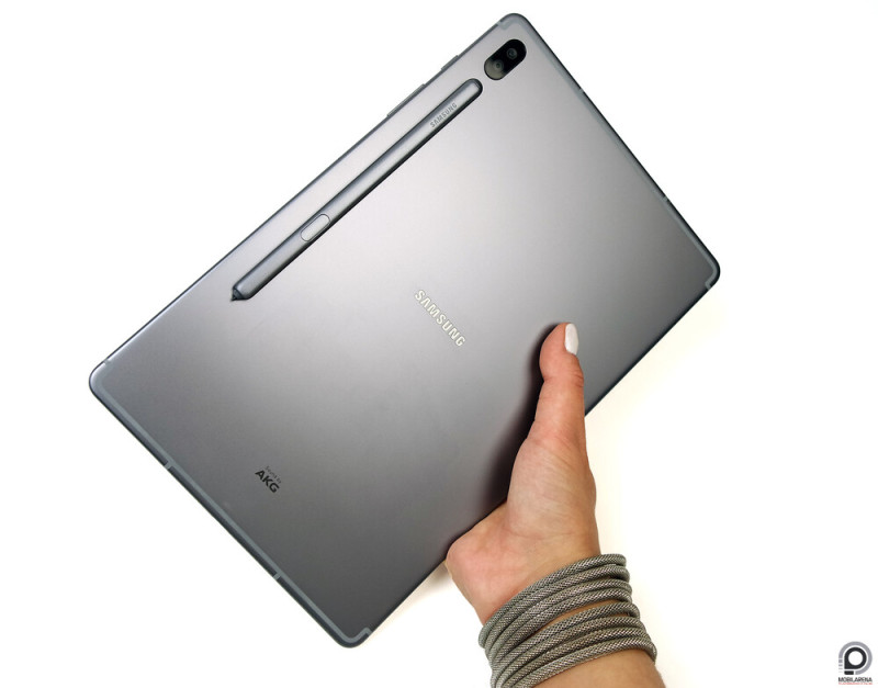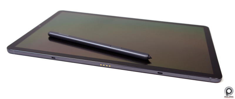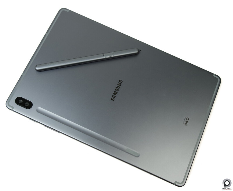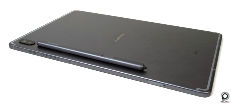 A Galaxy Tab S4-gyel ellentétben elhagyták az üveg borítást, ami kifejezetten jót tesz a fogásstabilitásnak, az alumínium hátlapon pedig kialakítottak egy mágneses S Pen csatlakozófelületet, ami egyben tölti is a 0,35 mAh-s akkumulátorral szerelt, kapacitív stylust. Így elsőre jól hangzik, a mágnes erős, nem esik le a toll, de összességében elég életszerűtlen megoldás. Letenni ugye nem igazán kényelmes a tabletet, ha a hátán van a toll, de ha lecsatlakoztatjuk, akkor aktívvá is válik, amitől merül, arccal előre meg valószínűleg senki nem szívesen teszi le a készüléket.