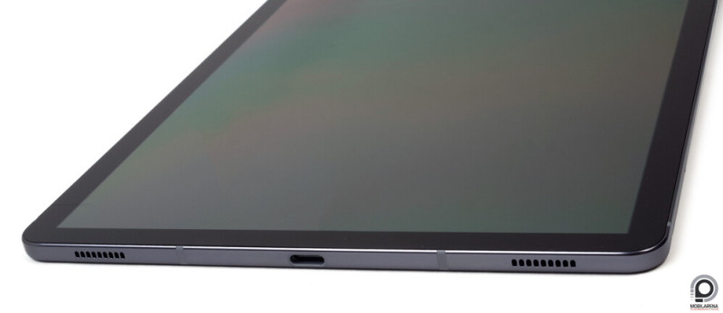 Az AKG megjelölés és a Samsung márkajelzés maradt a megszokott helyén, az immár kettős (13 MP normál + 8 MP ultraszéles) kamerarendszer viszont a bal sarokba vándorolt. A négy AKG hangszóró a rövidebb éleken helyezkedik el alul a Type-C port társaságában, felül pedig a másodlagos mikrofont közrefogva. A hosszanti élen balra a négypines Pogo dokkolófelület található, jobbra pedig a bekapcsológomb és a hangerőszabályzókon kívül a microSD befogadására is alkalmas nanoSIM tálca és a beszédmikrofon kapott helyet. Azért talán érdemes lett volna fizikai kezelőgombokat jobb kézre rendezni, nem valószínű, hogy álló nézetben ki tudnánk kapcsolni a készüléket tenyérrel.