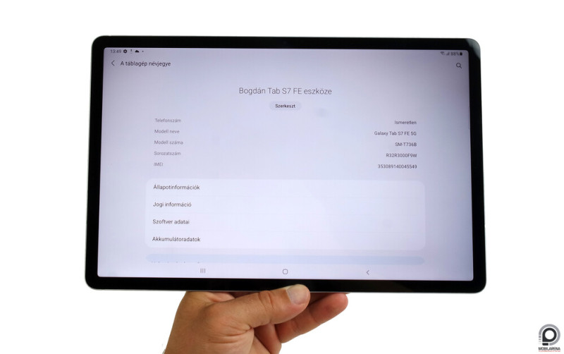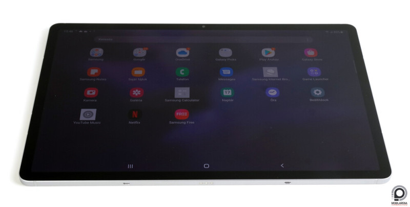 Úgyhogy fogták a Tab S7 és S7+ modelleket, majd gyúrtak a kettőből egy harmadikat, ráírták, hogy FE, és itt is van a kezemben. Mind a kettőben, mert a termék baromi nagy, ugyanis az S7+ volt a donor a méret kapcsán, szóval 12,4 hüvelykkel, valamint a rárakodó kávákkal együtt ez most a Samsung legnagyobb táblagépe. Bizonyára piackutattak egy csomót, hogy mi kell a népnek, lehet, hogy az jött ki, hogy az S7+ méretére van igény inkább, mert elsősorban munkaeszközként használják a mostani tulajdonosok is a masinát, szóval akkor viszont be lehet áldozni a 120 Hz-es Super AMOLED kijelzőt is, nyilván a Samsung felmérte, osztott, szorzott, kalkulált, ők sem ma kezdték a műfajt. Csak kicsit furcsa, hogy ami a telefonos fronton az S20 FE kapcsán pont előrelépés volt, az ebben az FE modellben a konstrukció talán leggyengébb pontjává vált.