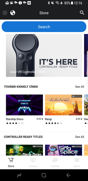 Ha minden telepítve és a telefon is a helyén, a júzer lényegében egy virtuális hotelszobában találja magát, ahol a levegőben lógnak az opciók, az appok, a játékok, az érdekességek, az ajánlók és minden egyéb. Újdonság, hogy lefele bólintva megjelenik a kontroller virtuális mása jobb vagy bal oldalon aszerint, mely kezes használatot jelöltünk meg. Azzal pedig késedelem nélkül, kis fehér csóvával és lézerszerű pötyivel lehet jelölni és bökni. Immáron tehát függetlenül fordulhat, bólinthat a fej és mozoghat a virtuális kurzor, a korábbiaknál kényelmesebben. Persze továbbra is bevethető a Gear VR oldalán lévő gombsor és érintőpanel, csak ezek után nincs értelme.