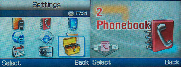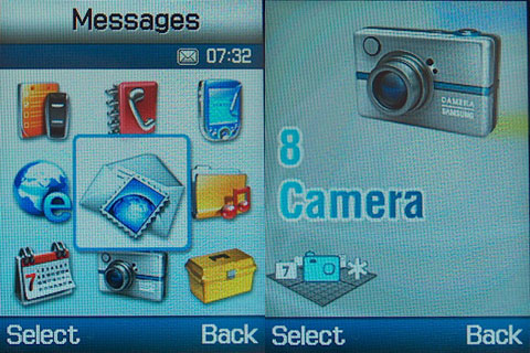 Maga a menü kétféle nézetben használható. Az ikonos nézet teljesen megegyezik a már ismert Samsung féle felépítéssel, a flash menü viszont abszolút egyedi. Grafikailag igen látványos, ahogy a kilenc menüpont különböző színnel össze-vissza forog a képernyőn a léptetés során, de valljuk be, hogy az ikonos nézet enyhén szólva jobban használható, miután a flash menü egyszerre csak egy funkciót mutat.