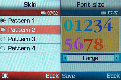 Természetesen ebben a Samsungban is variálható a színséma (négy változtat létezik), módosíthatjuk az operátori kiírások stílusát, a háttérképet, valamint a tárcsázási betűméretet és színt is. Sajnos itt is a középső gomb megnyomása egyből vinné fel a felhasználót a WAP-ra.