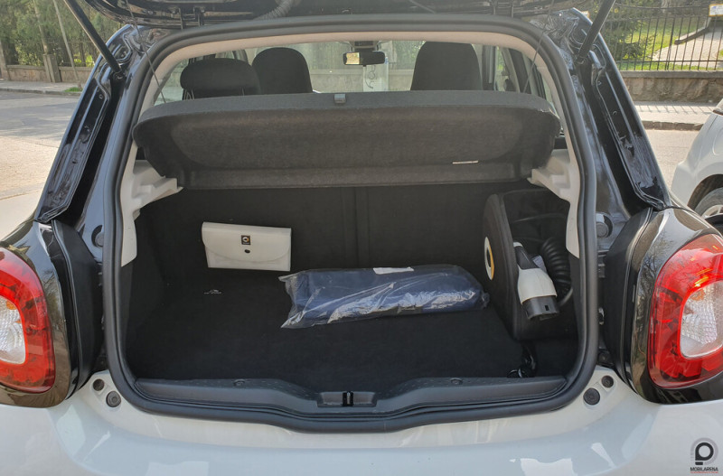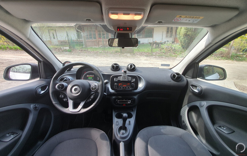 Az autóból mérete és formája miatt a kilátás jó, a tükrök kicsit aprócskák (a középső is, bent), elképesztően pici az eleje, de azért van neki, viszont nincs benne rakodóhely. A műanyag első fedelet előre lehet csúsztatni, így férhetünk hozzá a hagyományos akkumulátorhoz és az ablakmosó tartályához. Belül sem fogjuk elrejteni a cuccainkat, kesztyűtartó speciel nincs, az ajtózsebek kicsik, a két pohártartó viszont szabványos méretű. Nincs könyöklő, nincsenek rejtett zsebek és fiókok, ebből a szempontból nem áll jól a Smart. Még a töltőkábelnek sincs fixen kialakított helye hátul, az mindig ott tekereg a csomagtér padlóján.