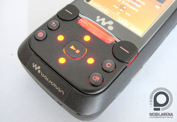 Ez alapvetően egy öt irányú navigációs rendszer, amelynek középső gombja egyértelműen látható, de a gyűrű iránybillentyűinek helyét csak egy-egy kicsiny, kerek LED jelzi. Az ember először érintőgombra gyanakszik, de nem: a fényforrások alatti terület benyomható. A kezelhetőség még így is szinte tökéletes, egyetlen hibája van. A kijelző alá ugyanis a Sony Ericsson is pakolt egy peremet annak érdekében, hogy könnyebben csúsztathassuk szét a készüléket, a perem alatt viszont egy széles, narancsszínű csík vonzza magára a figyelmet. Ennek benyomása indítja el a zenelejátszót.