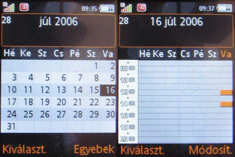 A beépített naptár nem fogja megrengetni a mobilos világot, havi, heti és napi nézetben láthatóak az események, előbbi kettő grafikus módon prezentálja a tennivalókat. Új esemény felvitele esetén nincs lehetőség arra, hogy típust adjunk meg: itt minden találkozó lesz. Természetesen helyszín, téma, időpont és riasztás is rendelhető a naptárbejegyzésekhez, sőt, a készülék kikapcsolt állapotban is hajlandó kukorékolni, ha a felhasználó így rendelkezik.