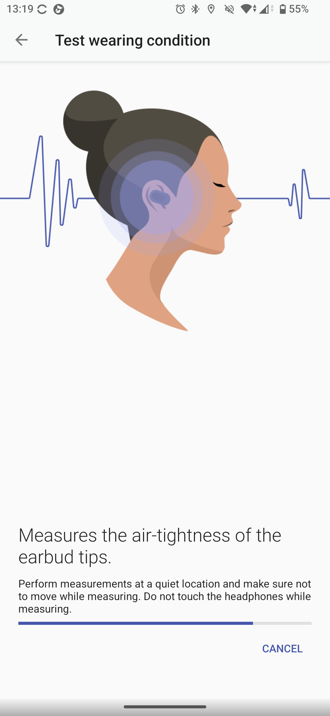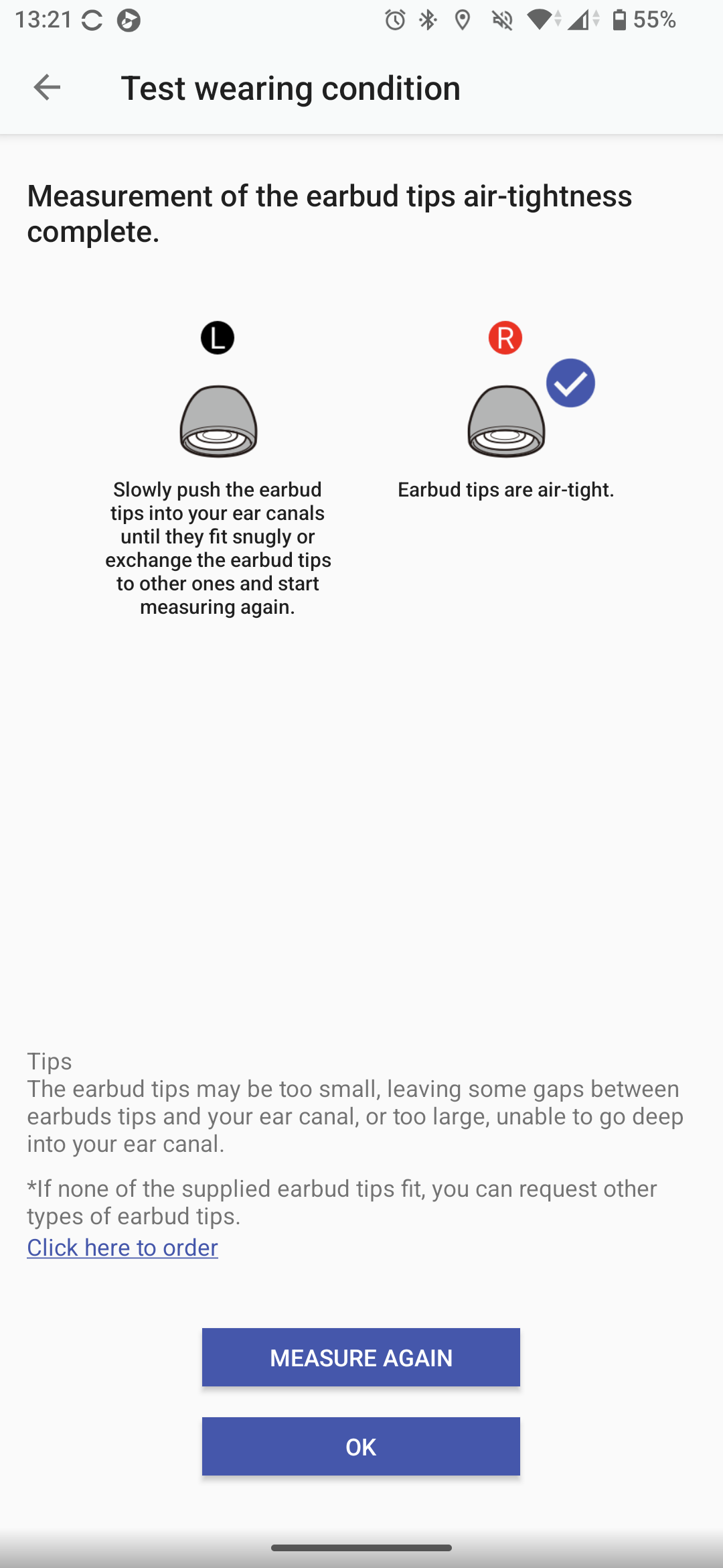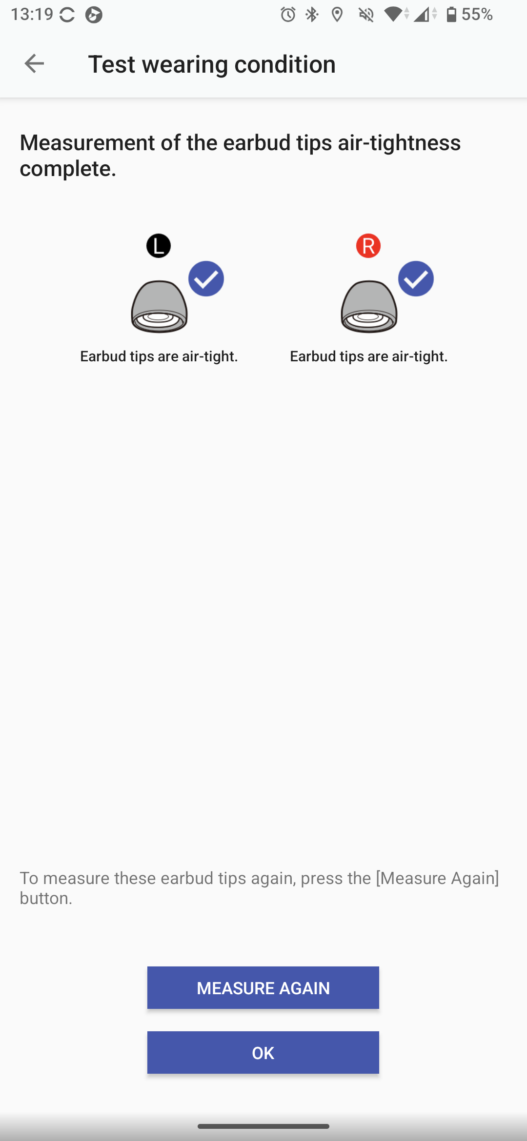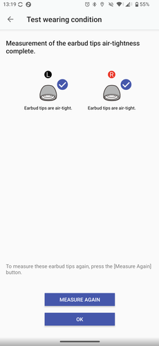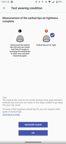 A memóriahabos párnák kiemelt szerepet játszanak az aktív zajszűrő rendszer működésében, így a pontos és kényelmes illeszkedés fontos. Ezt a Sound Connect alkalmazásban lehet ellenőrizni, a Test wearing condition menüpontban. Ilyenkor az app hangot játszik le a WF-1000XM6-on, az pedig mikrofonjaival megpróbálja meghatározni, mennyi szökik ki a fülből, mennyire szigetel jól a fülpárna.