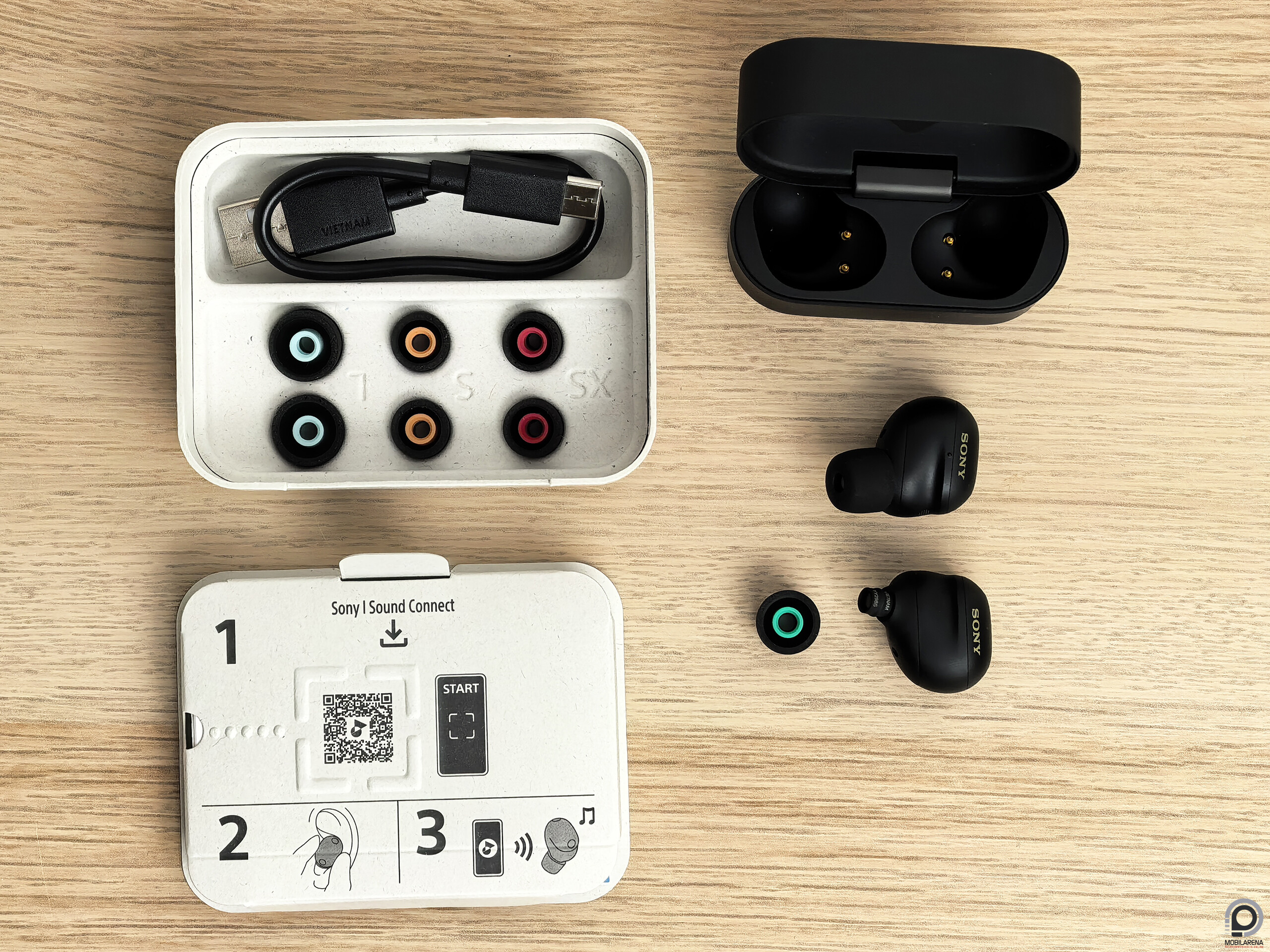 A csomagolás a Sony termékeinél megszokott műanyagmentes, komposztálható doboz, benne a fülhallgatók maguk hordozó tokjukban, papíralapú dokumentációk, garancialevél, és ha mindezt kivettük, legalul az USB-C töltőkábel és a csere harangok. A vetőcső az átlagnál szűkebb, de hosszabb, a memóriahabos fülpárnákból pedig összesen négy méretet biztosít a Sony: M-es van a fülesen, XS, S, L méret pedig várja a cserét a tokban, ha az M kényelmetlen.