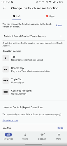Ez jól jön akkor például, ha a négyszeri tapintást kényelmetlennek tartjuk a hangerő változtatására, és szeretnénk helyette az érintve tartásra átprogramozni. Ugyan a Sony elmondása szerint az XM6 belső architektúráját úgy alakították ki, hogy jobban szellőzzön a korábbi modelleknél és csökkentse a test saját hangjainak (például rágás, nyelés, futás) visszhangját, azért az érintőfelület tapogatása tompa kopogásként hallható marad. Adott a beállítható lehetőségek között, hogy az ANC két módját (zajzár, Ambient, normál), a lejátszás/szünetet, a hangerő emelését/csökkentését rendeljük bármelyik érintési módhoz. A nyomva tartáshoz van egy plusz funkció, ez a Quick Attention névre hallgat, ez arra az időre, amíg ujjunkat a vezérlőfelületen tartjuk aktiválja a hangátengedést és lehalkítja a zenét.