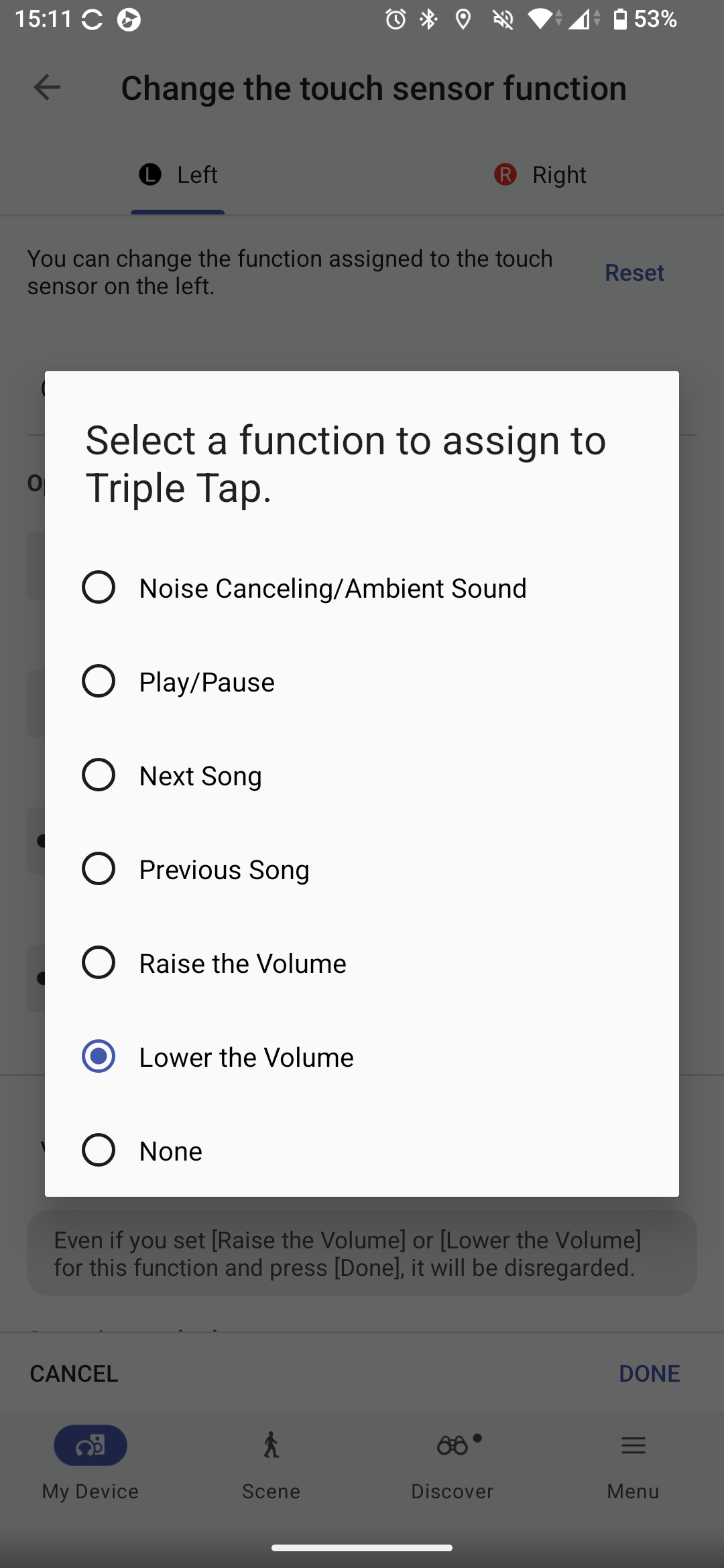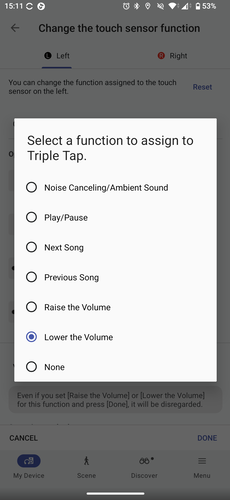 Az átprogramozáshoz a Sony Sound Connect alkalmazásra lesz szükségünk, ez Android és iOS rendszeren ingyenesen elérhető az alkalmazásboltokból. Mivel rengeteg extrát és egyéni beállítást lehet elérni benne, mindenképp ajánlott letöltése, bár magyarul sajnos se iOS, se Android verziója nem tud. A vezérlés beállításaihoz a Controls menüpontot kell megkeressük, itt külön tudjuk a jobb és a bal fülhallgató érintőfelületének feladatait szerkeszteni. A Sony kínál előre fixált lejátszásvezérlő beállításokat (egy érintés: lejátszás/szünet, két érintés: előre, három érintés: hátra), de ezeket a Custom funkcióval ki tudjuk kerülni és minden érintési, érintve tartási lehetőségre állíthatunk be egyedi igényeinknek megfelelőt.