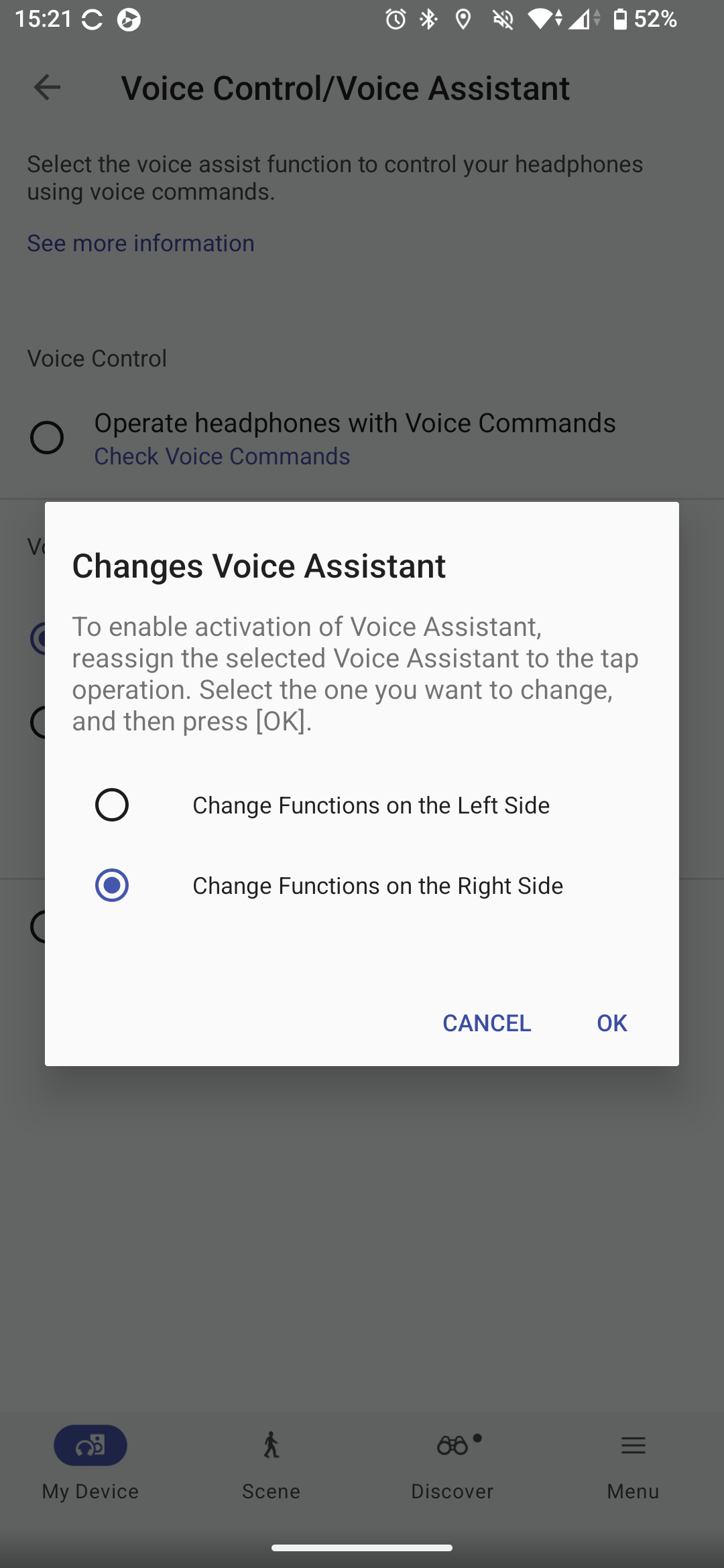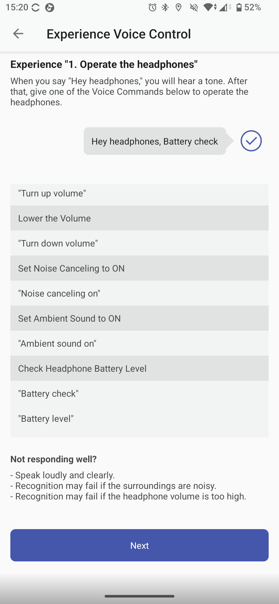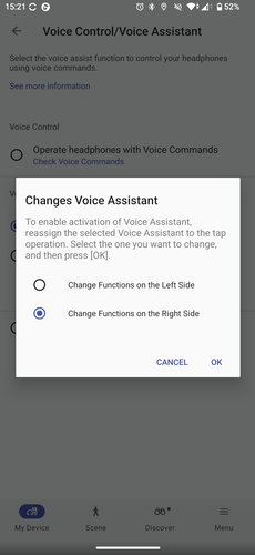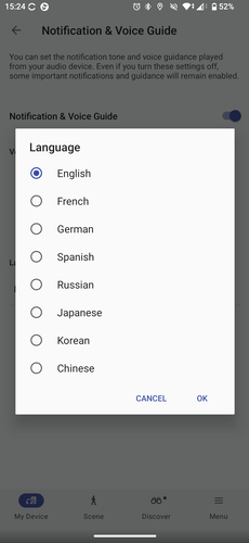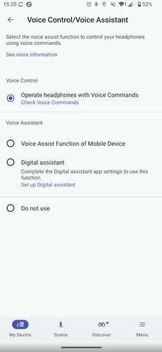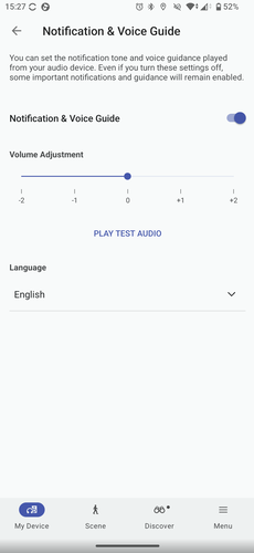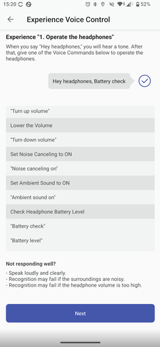 Nem a Controls menüben fogjuk megtalálni, de az XM6 irányítható hangunkkal is, valamennyire. A Voice Control/Voice Assistant menüben két lehetőségünk van. Az egyik a Sony saját, integrált asszisztense, ezt a „Hey, headphone…” paranccsal aktiválhatjuk, majd kiadhatjuk neki, mit csináljon. Angolul, németül, franciául, spanyolul, oroszul, japánul, koreaiul vagy kínaiul ért, a nyelv beállítást viszont külön, a Settings – Notification and Voice Guide menüben tudjuk megtenni. Itt lehet a visszajelzések hangerejét is beállítani egyébként. A Sony saját asszisztense arra jó, hogy a fülhallgatók töltöttségét jelezze, számot léptessen, elindítson, szünetre állítson lejátszást.