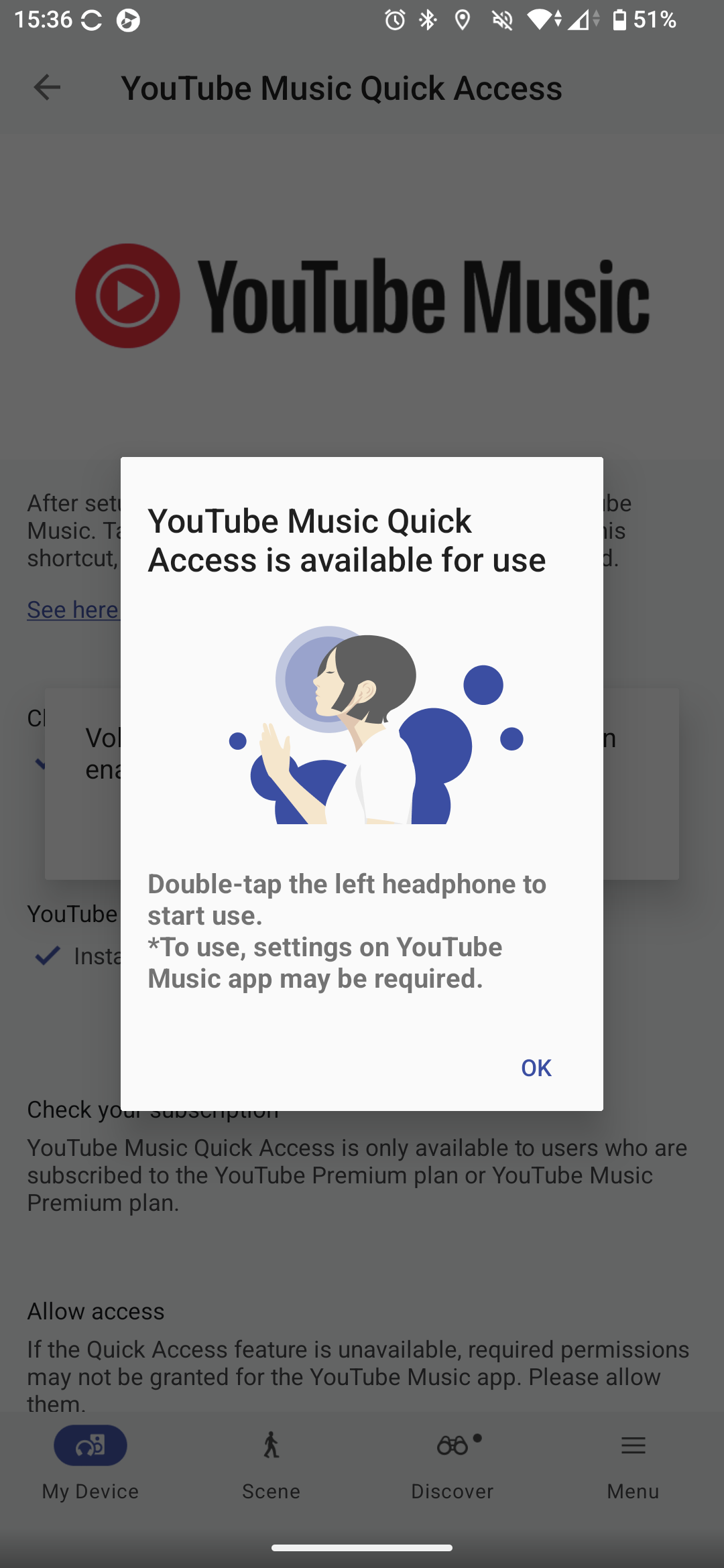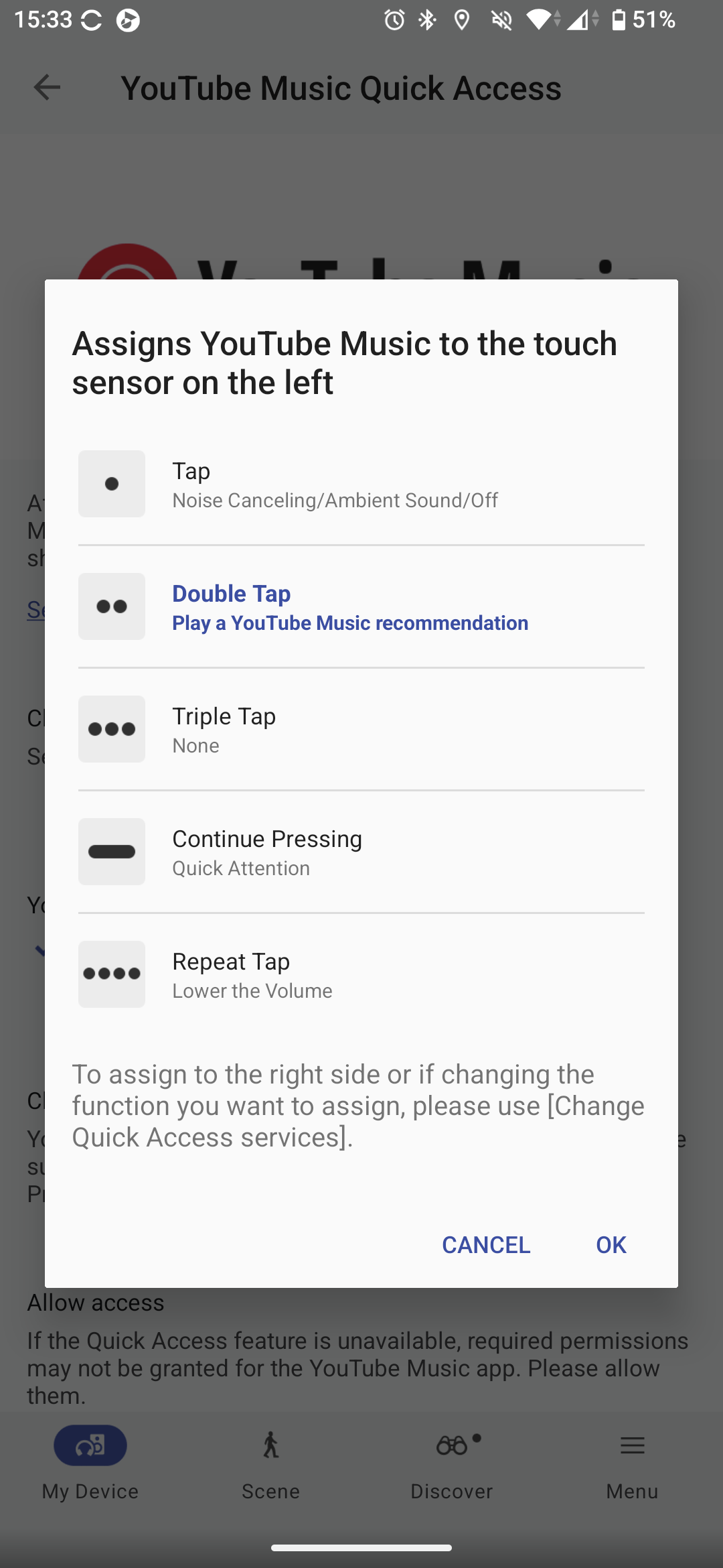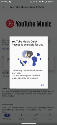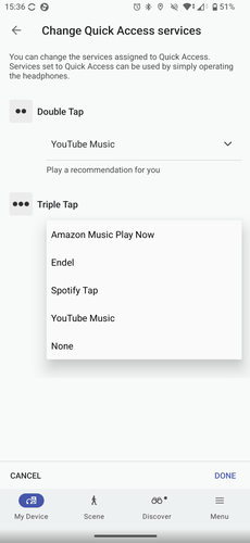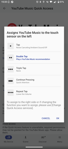 Ám még mindig nem értünk az irányítási lehetőségek végére az XM6 kapcsán. Ez a fülhallgató is tudja a Quick Access extrát, vagyis két tapintással a vezérlőfelületén elindítható Spotify, Amazon Music, Endel, és immáron YouTube Music lejátszás is. Ez viszont kötelezően a bal oldali fülhallgató dupla érintés funkciójára programozza rá a gyors indítást, és csak a bekapcsolása után tudjuk átállítani háromszoros koppintásra vagy a jobb oldali fülesre.