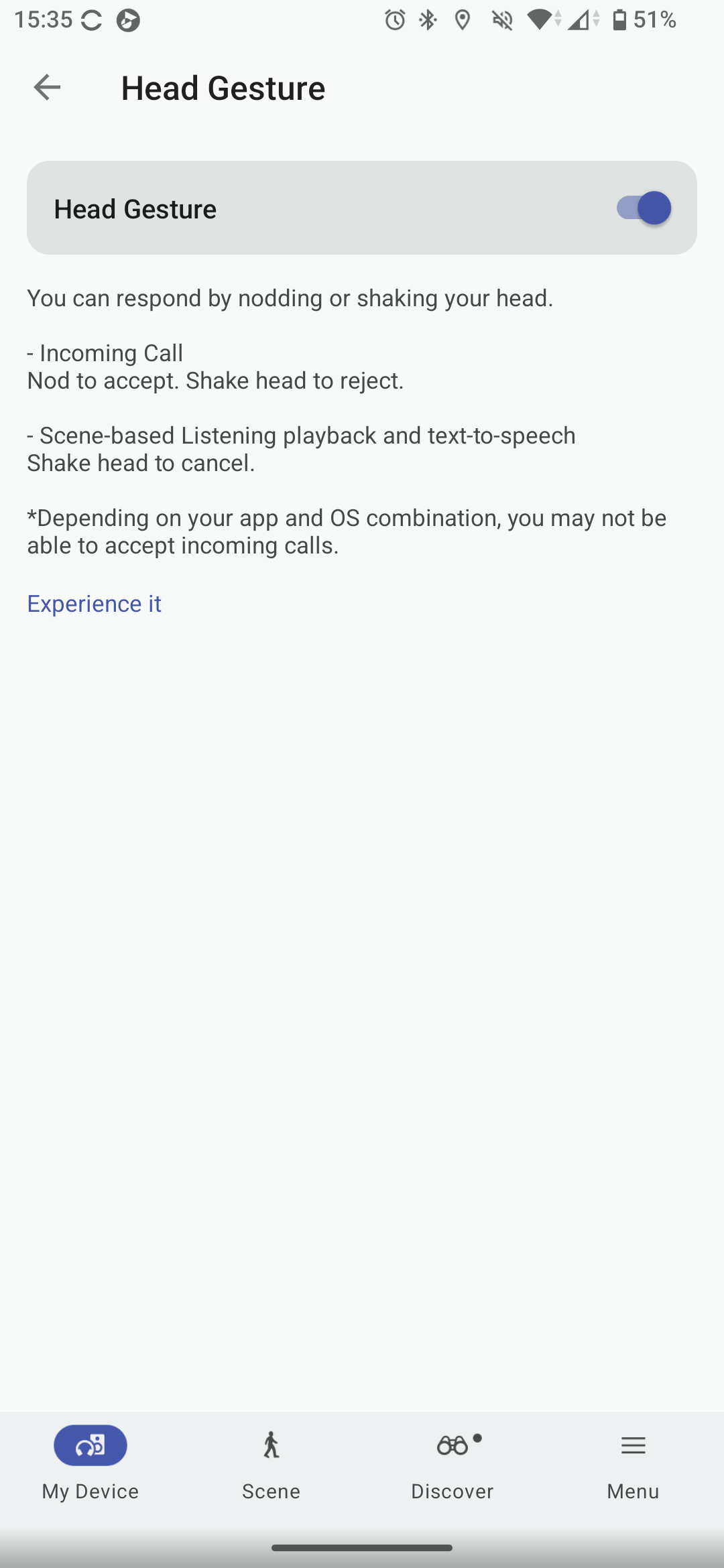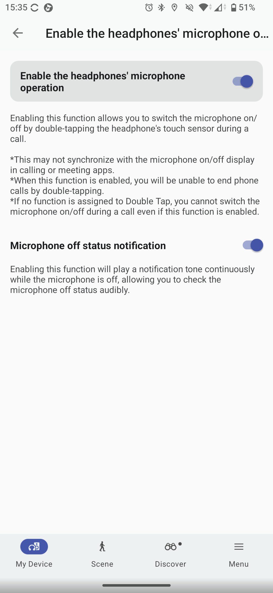 És még mindig nincs vége! Támogatja az XM6 a fejjel történő gesztusvezérlést, a Head Gesture menüpontot kell megkeressük ennek bekapcsolásához. Bólogatásra felvehető hívás, fejrázással elutasítható. A funkció működik, még csak nagyon drámai mozdulatokat sem kell hozzá tenni. Adott annak a lehetősége is, hogy hívás közben lenémítsuk a mikrofonokat, ezt kétszeri koppintással lehet az érintőfelületen megtenni, de csak akkor, ha telefonhívásban vagy videokonferencián veszünk részt. Külön kapcsoló szolgál arra, hogy beállítsuk, szeretnénk-e a mikrofonok némításáról visszajelző hangot.