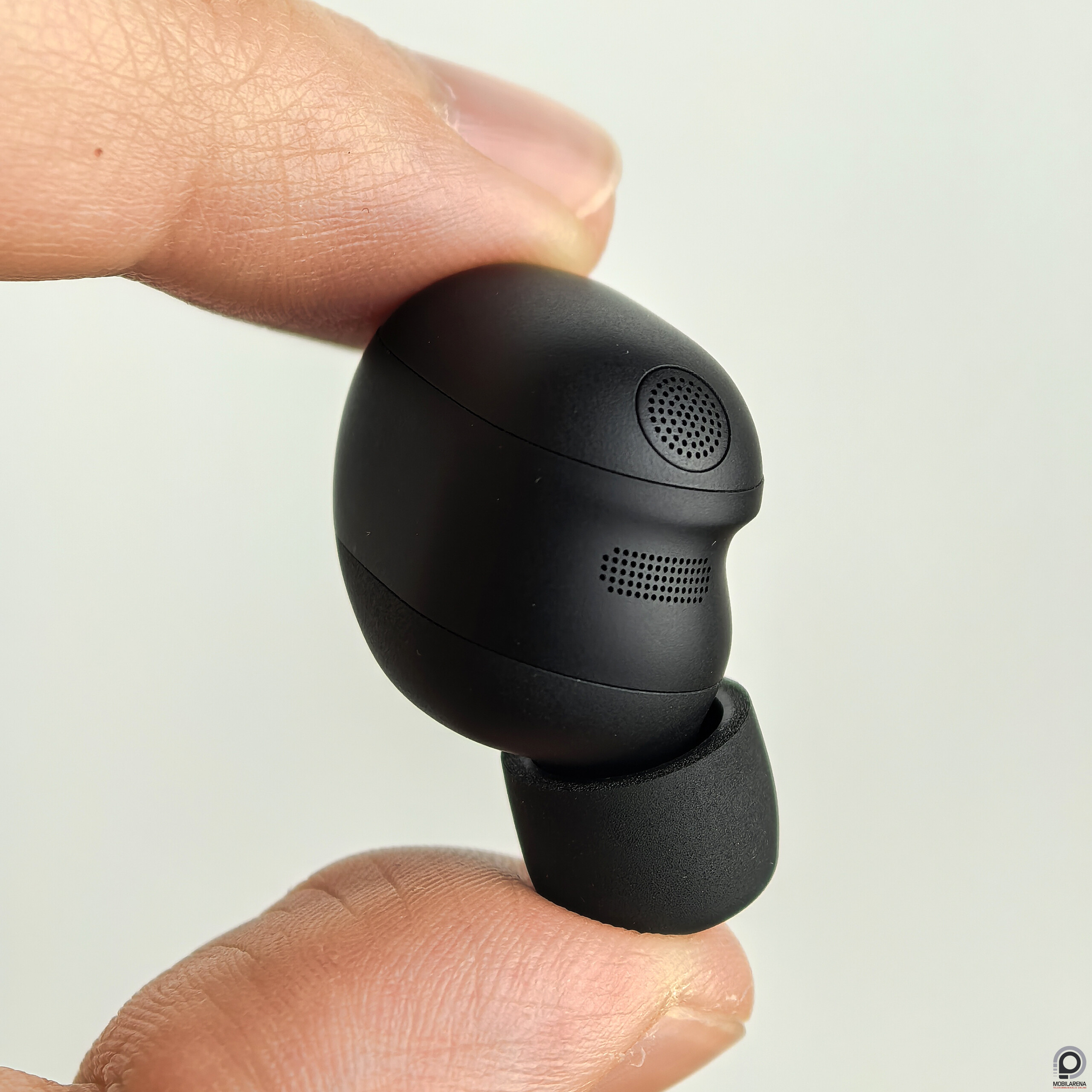 Ha közvetlen elődjéhez, a WF-1000XM5-höz viszonyítjuk, akkor 11%-al lett kisebb az XM6 mérete. Ez számszerűsítve a hordozó tok esetén 61 mm-es szélességet, 26 mm-es mélységet, 40 mm-es magasságot jelent, a tok 47 grammot nyomott mérlegünkön. A fülhallgatók maguk 6,5 grammot mutattak a mérlegen. Az XM6 leghosszabb pontján, az illeszték kezdetétől a fülhallgató testének végéig 29 milliméter, széltében 22 milliméter, mélysége pedig az illesztéket is hozzászámolva 20-21 milliméter között van. Az én fülemben stabilan és kényelmesen megült, de a WF-C710N kompaktabbnak érződik, így számomra az kényelmesebb viseletet biztosított, és bár a LinkBuds Fitet nem próbáltam, az is kisebb, így feltételezem valamivel könnyebb is a kis fülűeknek. Az illeszkedésről nem tudok többet írni, mert ahány ember, annyi fül. Az XM6 formáját tekintve látványos változás, hogy a fülből kifelé néző oldalán van egy apró fogást segítő kis kiemelkedés, ezzel a Sony azokra a kritikákra reagál, melyek szerint a tokból való kivételkor túl könnyen kicsúszott az XM5 a felhasználók kezéből. A tokban a szokásos módon mágnesek tartják a fülhallgatókat helyükön, a töltés pedig pogo pines csatlakozókkal történik.