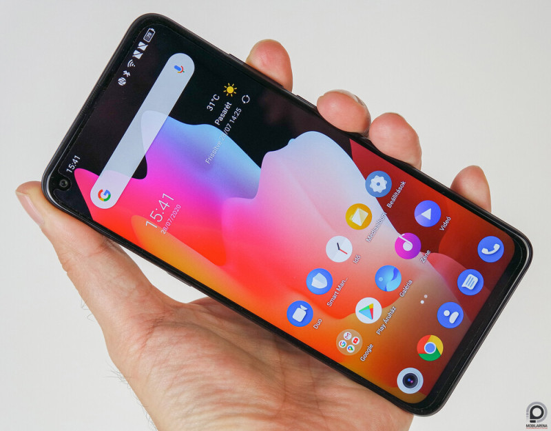 A plasztik házat remekül egyberakták, viszont csak a bekapcsoló jobbra esik kézre: felette a hangszínszabályzóért, balra a Google Segédért, hátul pedig a megbízható ujjlenyomat-olvasóért kell férfikézzel is nyújtózni. De legalább a 10L nem billeg az asztalon, megvan a jack port felül, a Type-C kimenet alul, a hibrid nanoSIM tálca balra, valamint a fénymérő és a közelségérzékelő elöl, alig észrevehető beszédhangszóróval. A multimédiás hangkeltő alul kiált fel, feliratot pedig csak a visszafogottan csillogó hátoldalon találni, úgyhogy a 162,2 x 75,6 x 8,4 milliméteres és 180 grammos házon a 6,53”-es panel vonzza leginkább a tekintetet.
