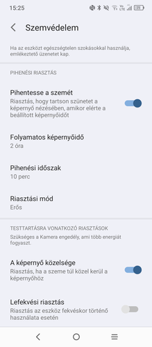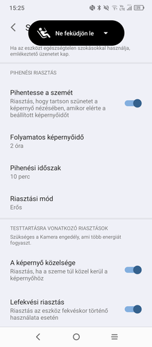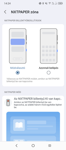 Megvan a Widevine L1-es DRM-szint, így megy a nagy felbontású stream SVoD szolgáltatásokon keresztül, viszont HDR megjelenítésre nem képes a telefon. A helyzet megint ugyanaz, mint már említve volt: amíg nem éri közvetlen fény a panelt, addig tök rendben van, bár a matt felület videós tartalmak esetén a vonalakat kissé mosottá változtatja, nincs olyan élessége, mint egy hasonló felbontású OLED kijelzőnek. De nem is az a célja a TCL-nek, hogy egész nap a telefont bámuljuk, a szoftverben található több olyan funkció, melyek figyelmeztetik is a felhasználót ha túl közelről nézi telefonját, ha túl sokáig nézi, vagy akkor is, ha féloldalasan fekve bámulja a mobilt. Ezekhez a funkciókhoz az előlapi kamerát veti be a mobil, ahogy a 2D-s arcfelismeréshez is, és néha pontatlanságba fullad a funkció túlbuzgósága, például az asztalra fektetett telefonra ránézve az asztal mellett állva is kiírta az értesítést, hogy ne tartsam olyan közel az eszközt. De van a giroszkópra támaszkodó rezgési riasztás, illetve olyan is, ami arra figyelmeztet, hogy a környezeti fények túl sötétek, vegyük lejjebb a fényerőt és kapcsoljuk be az éjszakai módot. Ezek egyike sem aktív alapból, a NxtPaper zóna nevű menüpontban tudja a felhasználó elérni a funkciókat, ugyanígy a DC elsötétítést is kézzel kell kapcsolni a beállításokban vagy a vezérlőközpont gombjai közt.