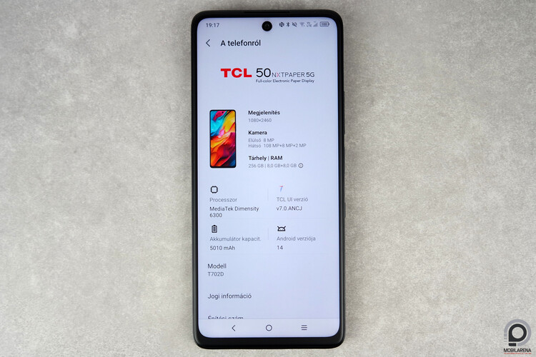 A képernyő sarkainál egyébként látható némi szürkésedés, a háttérvilágítás nem tökéletesen homogén, viszont ettől eltekintve jó minőségű LCD-t találunk a TCL telefonjában, ha valaki szeretné elkerülni az OLED megjelenítőket, érvényes ez az alternatíva. Van adaptív fényszabályozás a keretbe épített érzékelőre támaszkodva, ez megbízhatóan működött. Állítható a színhőmérséklet, van NXTVision a videók és fotók megjelenítésének javítására, illetve van olyan olvasómód is, ami csak monokrómra cseréli a rendszer színeit. Az említett tintapapír mód ennél egyel tovább megy, tökéletesen lapos ikonokkal, legtöbbször kitöltés nélkül, csak körvonalakkal, melegebb színárnyalattal és fehér helyett sárgás hátterekkel.