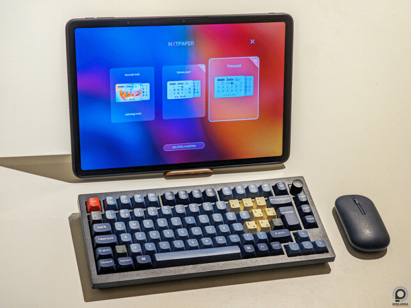 A váltáshoz hosszú oldalon jobbra dedikált billentyű is akad, épp csak eggyel kényelmetlenebb a nyomás és váltás helyett az, hogy a képernyőre kell bökni és a kívánt módot leokézni. Nyilvánvalóan van kereslet a Nxtpaper képernyők iránt, ha kisebb mobilpaneltől óriástábláig van a gyártónak kínálata, de azért akad pár furcsasága a dolognak szoftveroldalról.