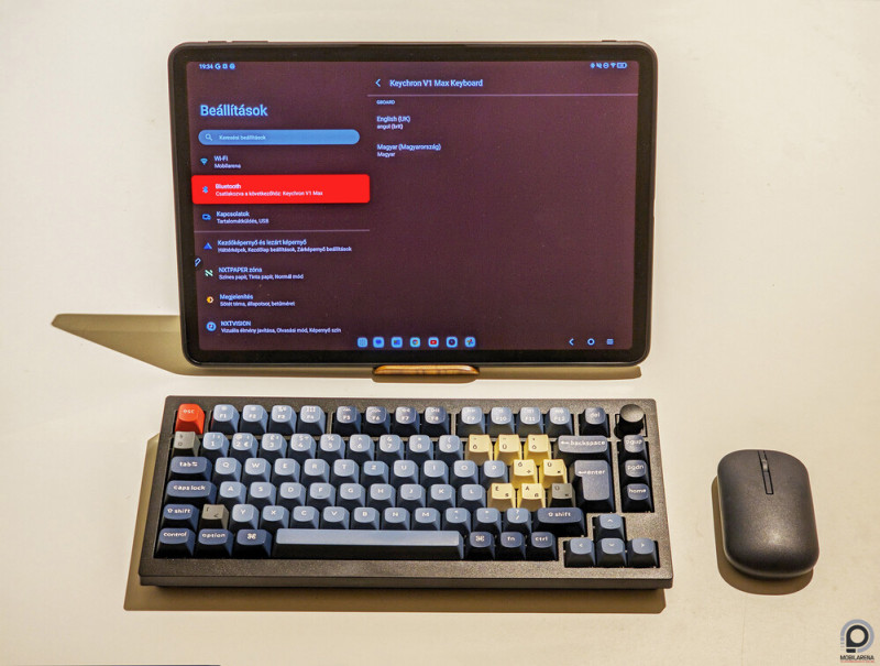 Egyszerűbb ugyanis a 14,3”-es, 120 ezer forintos TCL Nxtpaper mellé Bluetooth billentyűzetet csapni, mint egy laptopot a klaviatúrájától megszabadítani, és a gyártó 10 ezer forintért éppúgy kínál ilyen tartozékot angol kiosztással, mint apró állványt, a képernyőre hajtható, támasztékos tokot, támaszték nélküli hátlapi fedőt (lásd lent) és T-pen stylust. Az utóbbi kettő a december-januári bevezetés környékén várhatóan promóciós ajándék lesz. Az itt látható állvány, toll, egér és billentyűzet más márkától érkezett.
