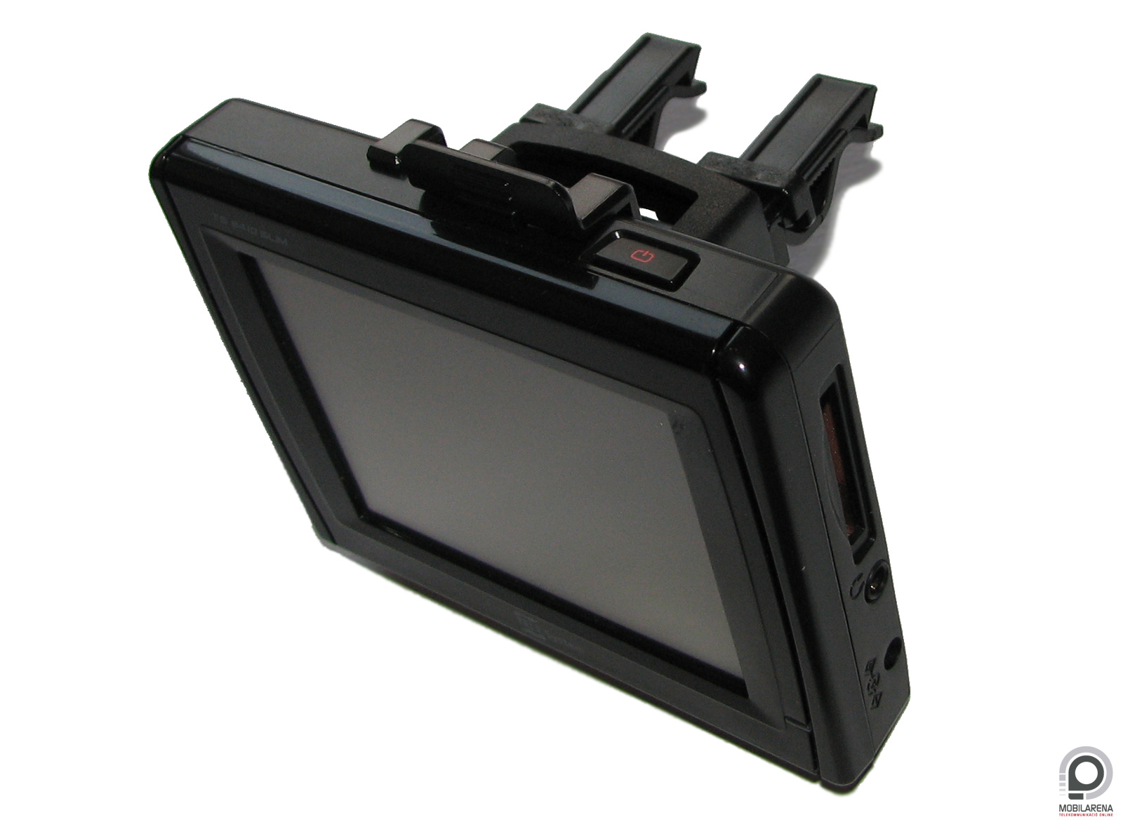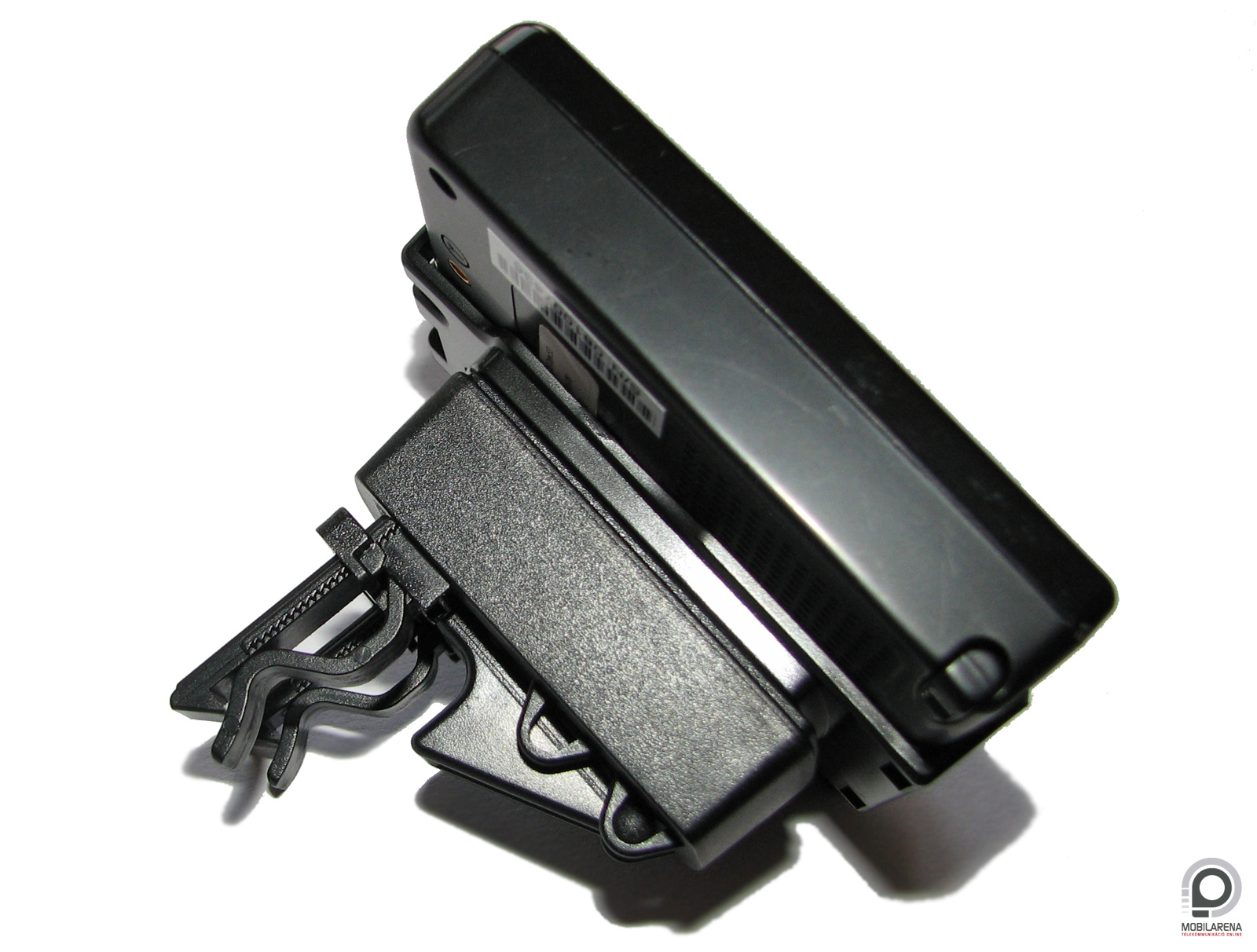 A dobozból miniUSB végű autós töltő kerül elő, adatkábel, kis szütyő a hurcolászáshoz, viszont hol van tartókar? Marhára nincs, helyette egy olyan kiegészítőt kapunk, amit a gép hátuljára lehet tapasztani, s innentől az egész cucc felcsíptethető az autó szellőzőrostélyára. Ez vicces spórolás, lévén nem minden autóval kompatibilis. A forgalmazónál egyébként 2000 forintért is kapható tartókar, úgyhogy némi plusz költségért cserébe a hagyományos rögzítés is megoldható. Maga a készülék anyaghasználat szempontjából sem vészes, természetesen plasztik, de fogása és tapintása nem kellemetlen.